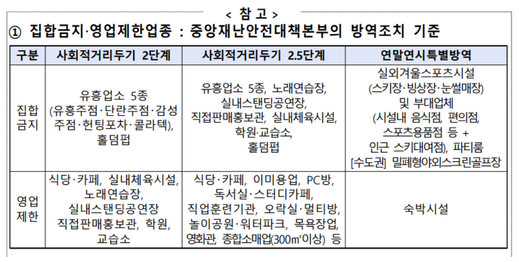 - 사회적거리두기 2.5단계 : 유흥업소 5종, 노래연습장, 실내스탠딩공연장, 직접판매홍보관, 실내체육시설, 학원, 교습소, 홀덤펍