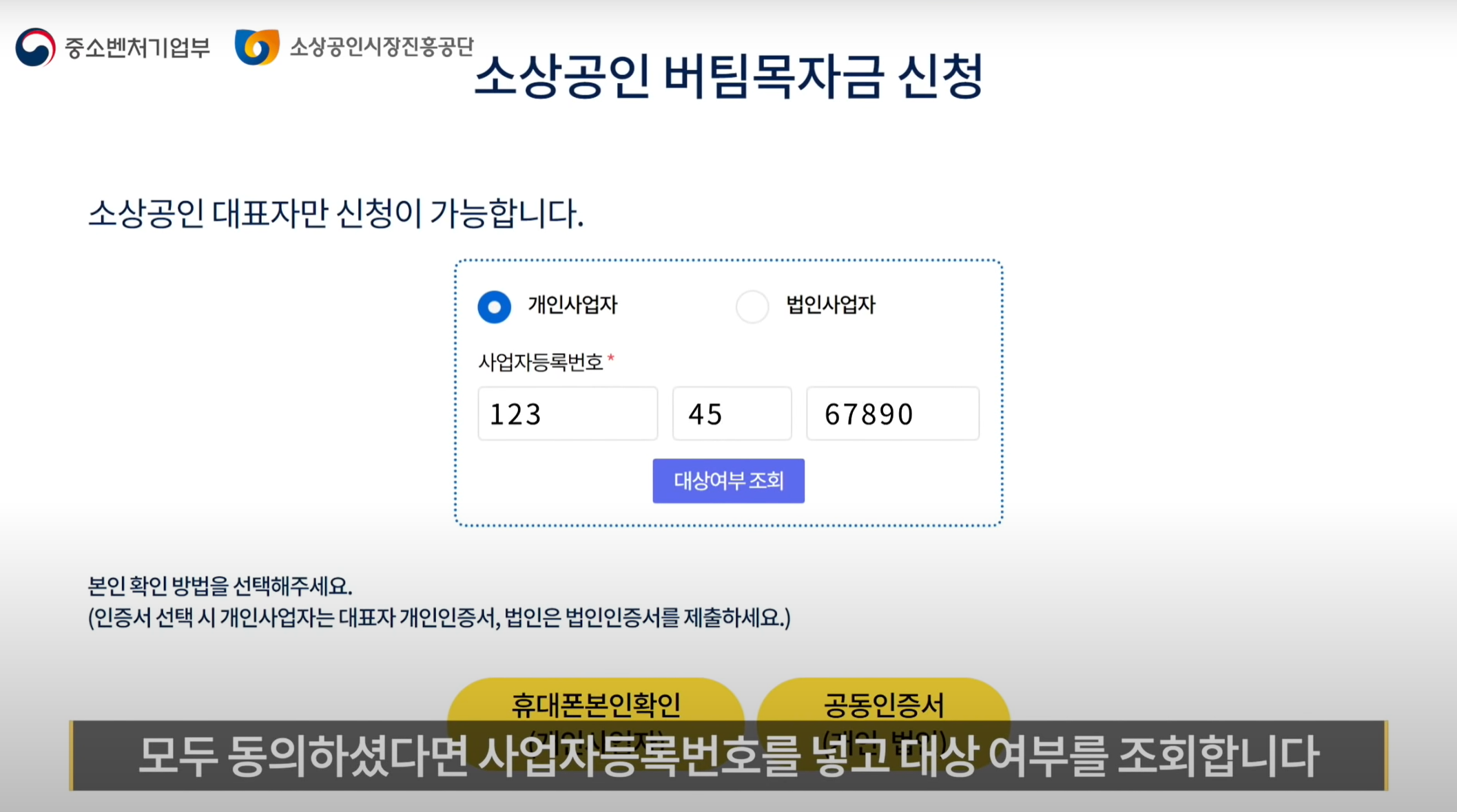 - 개인사업자 : 대표자 명의에 휴대폰 또는 공동인증서로 인증